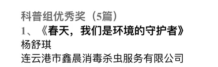連云港市鑫晨消毒殺蟲服務(wù)有限公司楊舒琪《春天,我們是環(huán)境的守護(hù)者》獲得2021年“衛(wèi)康杯”征文賽科普組優(yōu)秀獎(jiǎng)。